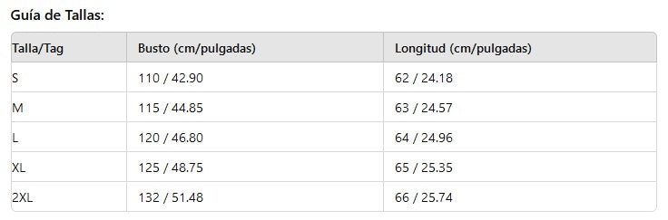| Size/Tag | Bust (cm/inches) | Length (cm/inches) |