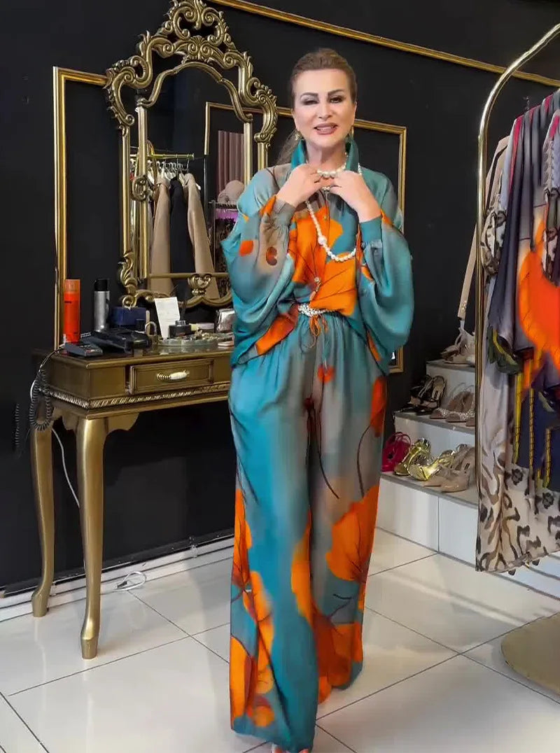 Conjunto de 2 Piezas para Mujer - Top de Satén con Estampado Posicionado y Pantalones Anchos