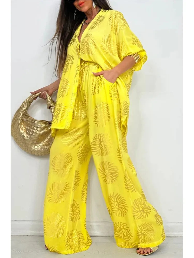 Este sofisticado conjunto de dos piezas combina una camisa larga de diseño estampado con efecto dorado y un pantalón de pierna ancha para lograr una silueta elegante y relajada. Ideal para mujeres que desean un look refinado y cómodo, con un estilo llamativo y moderno.