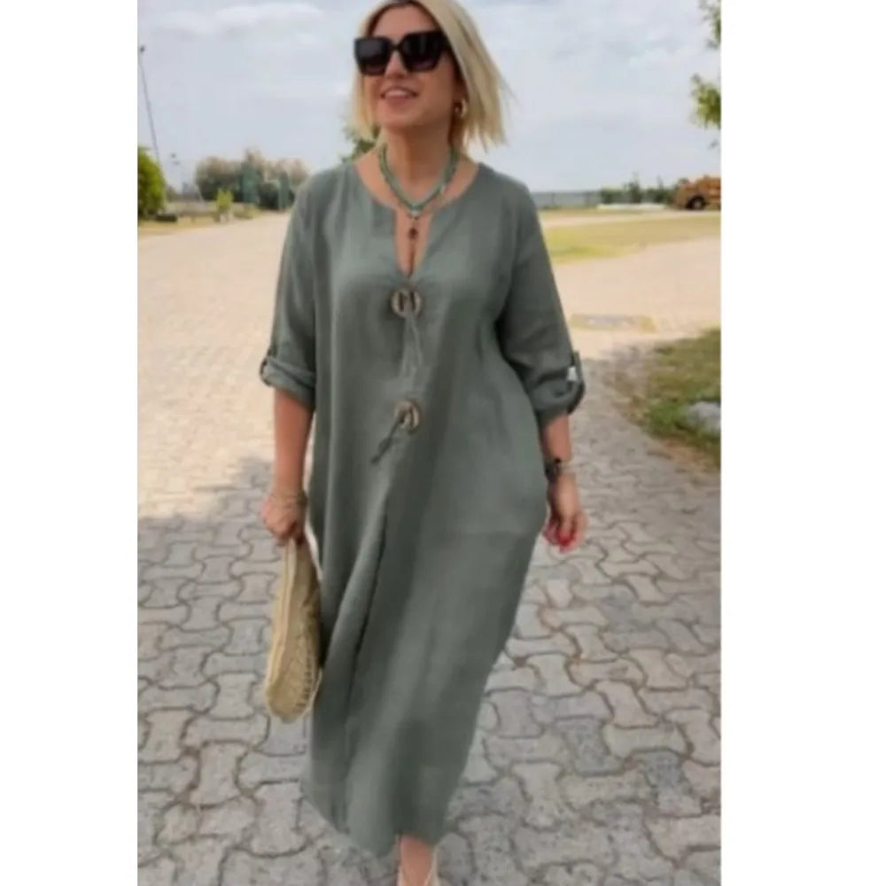 Descubre este elegante vestido largo de color sólido, perfecto para lucir fresca y con estilo en cualquier ocasión. Su diseño de corte suelto y escote en V añade un toque de sofisticación mientras garantiza comodidad durante todo el día.