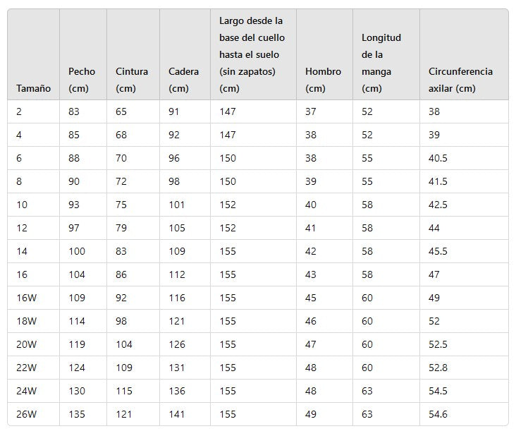 Las tallas 16W a 26W están diseñadas específicamente para ofrecer un ajuste cómodo y favorecedor para mujeres con proporciones más amplias. Estas tallas plus size cuentan con un mayor espacio en áreas clave como busto, cintura, cadera y brazos, asegurando que el vestido se ajuste perfectamente a cada cuerpo.