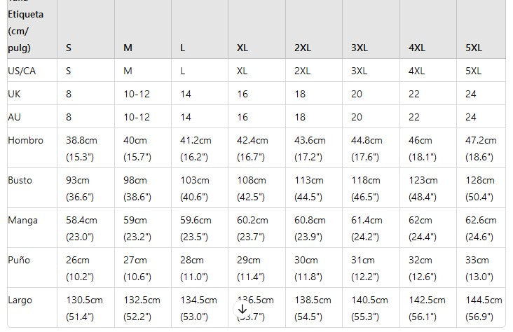 Tallas disponibles: M, L, XL, 2XL, 3XL, 4XL, 5XL
