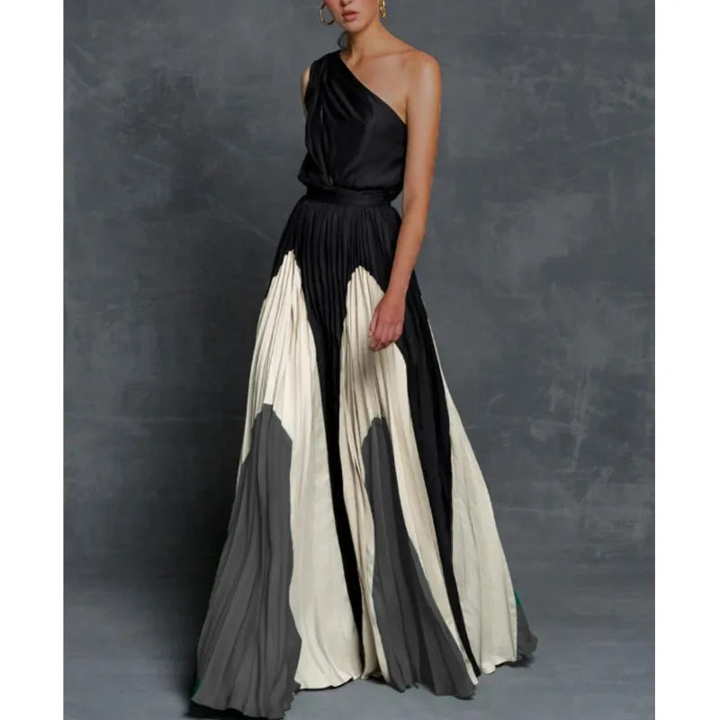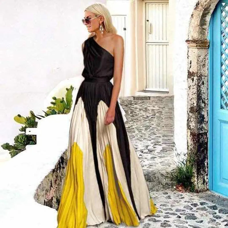 Vestido largo con diseño de un solo hombro y corte fluido, ideal para primavera y verano. Su estilo patchwork combina tonos y estampados de forma elegante, mientras que la silueta en línea A favorece la figura. Perfecto para un look sofisticado y cómodo tanto en entornos urbanos como en días de descanso.