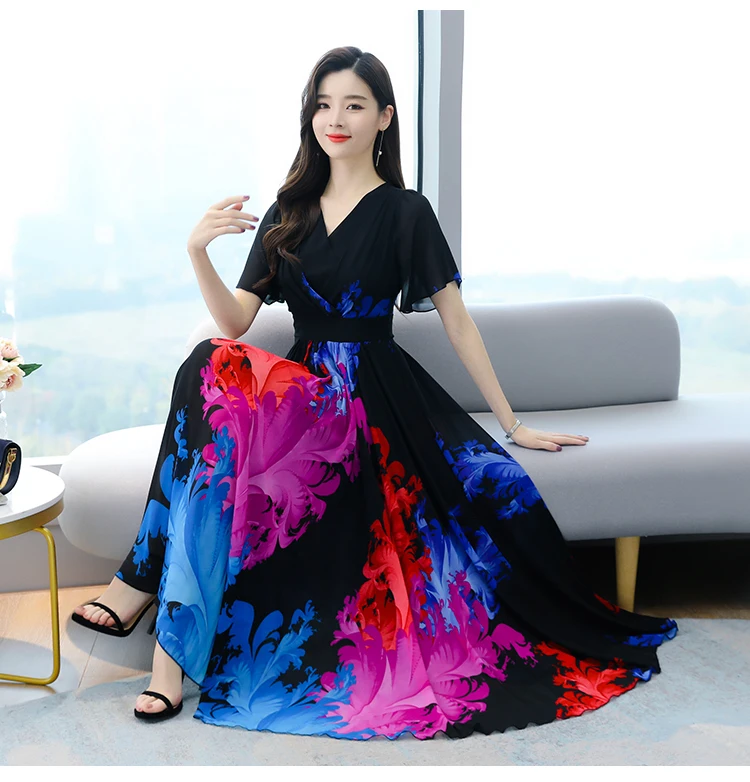 Long Yellow and Black Printed Chiffon Dress - Flow with Style on the Beach or at a Party!