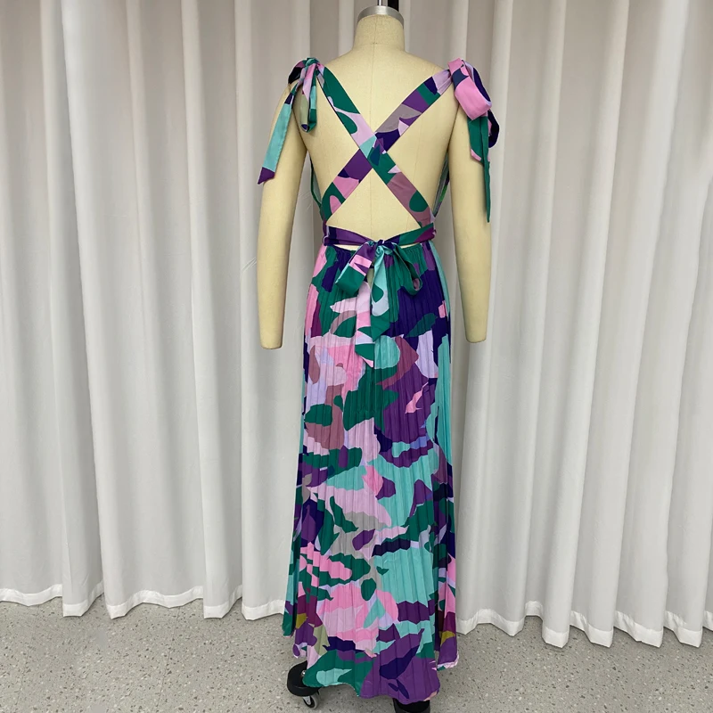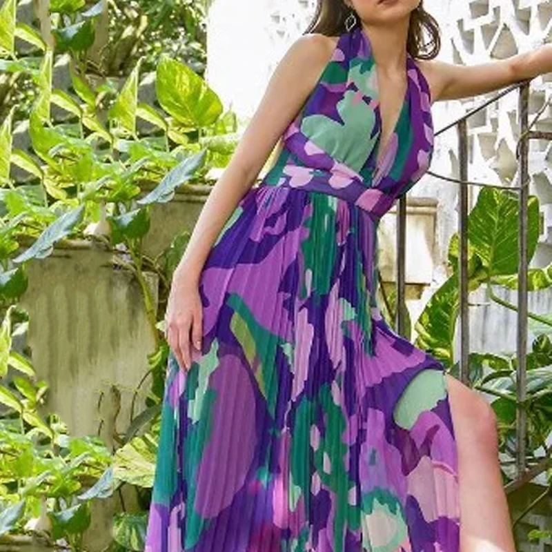 Its bohemian style with a pronounced V-neckline and open back will make you look sensual and fashionable . The fitted waist and A-line flatter the silhouette, while the draped and pleated details add a touch of elegance and romanticism .