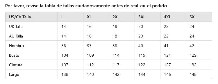 - Tallas Disponibles: L, XL, XXL, 3XL, 4XL, 5XL