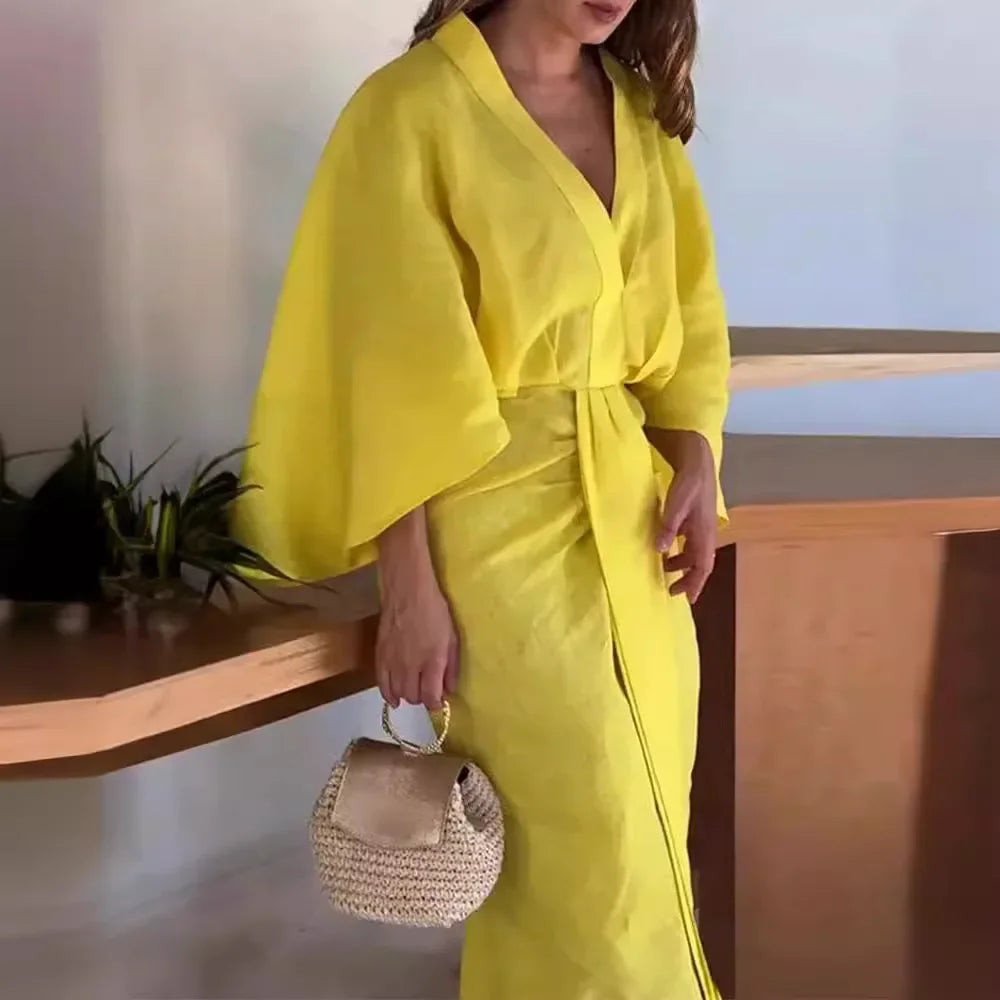 Este vestido largo de verano combina un diseño fluido y favorecedor con un estilo relajado y sofisticado. Su escote en V profundo, mangas tipo murciélago y corte alto en la cintura realzan la silueta y brindan comodidad, ideal para los días cálidos.