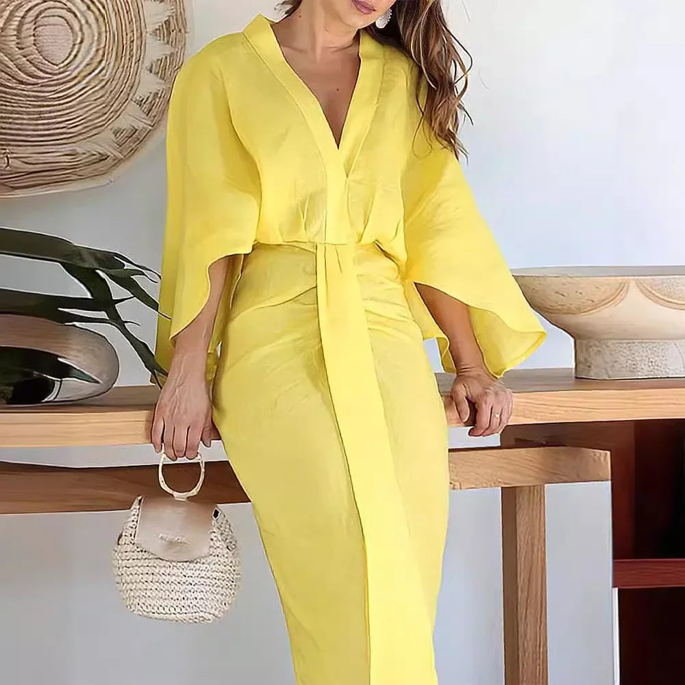 Vestido Midi Verano con Mangas Murciélago y Escote en V – Corte Alto y Elegante