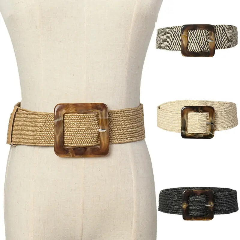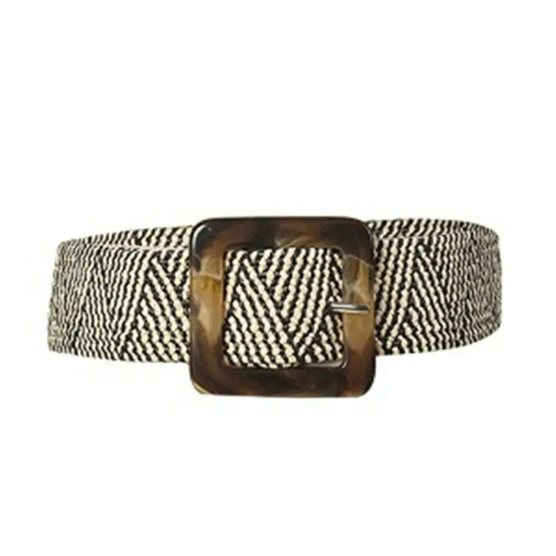 Cinturón femenino de diseño artesanal con cuerpo trenzado en paja sintética (PP Straw) y hebilla decorativa de madera tallada. Su estilo natural y elástico lo convierte en el complemento ideal para vestidos, camisas o túnicas. Añade un toque bohemio, elegante y veraniego a cualquier look.