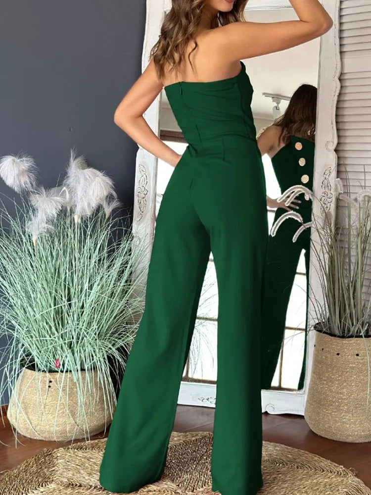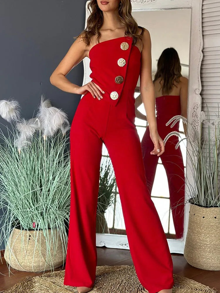 Mono elegante de diseño asimétrico y escote bandeau, decorado con botones metálicos frontales. Una pieza versátil y moderna ideal para destacar en salidas nocturnas o eventos casual chic.