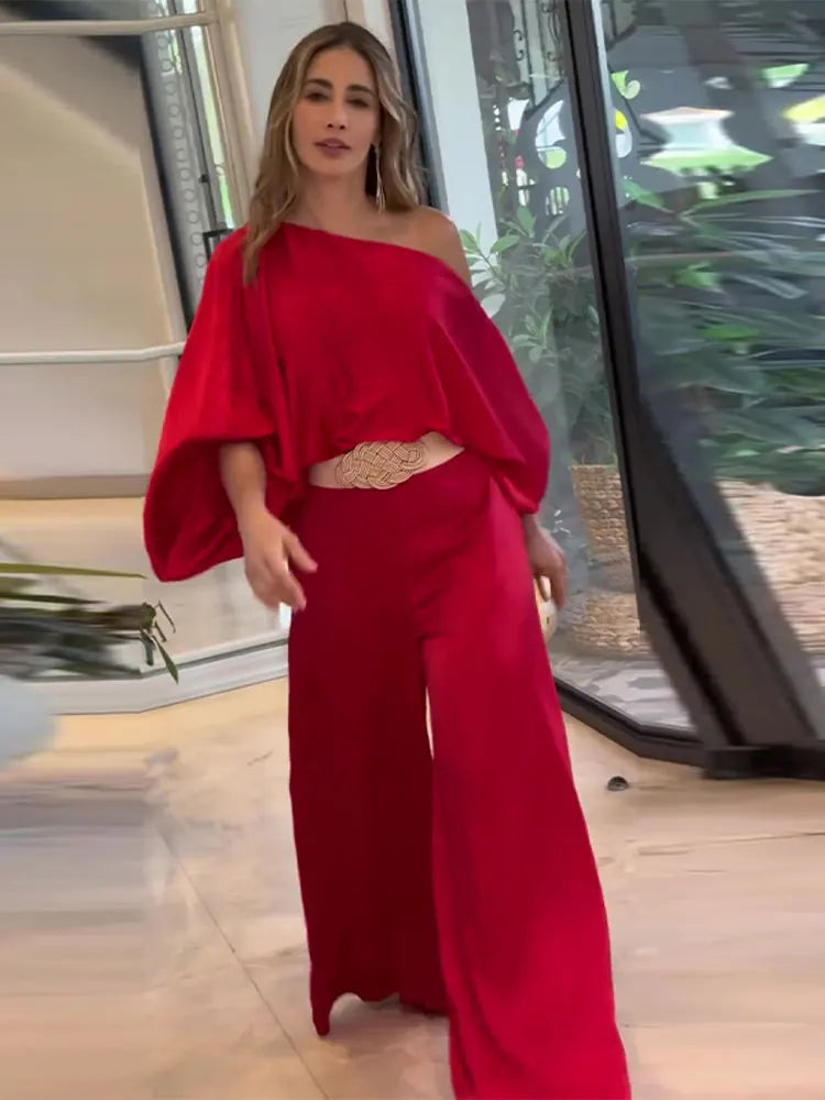 Diseño moderno: Conjunto de dos piezas con top de un hombro, mangas murciélago y pantalones de pierna ancha.