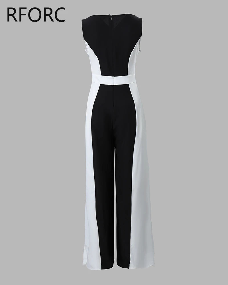 "¡Elige elegancia y comodidad con este mono formal! Con cuello en V, diseño de patchwork y pantalones wide-leg, es perfecto para looks de oficina o eventos especiales en cualquier temporada."